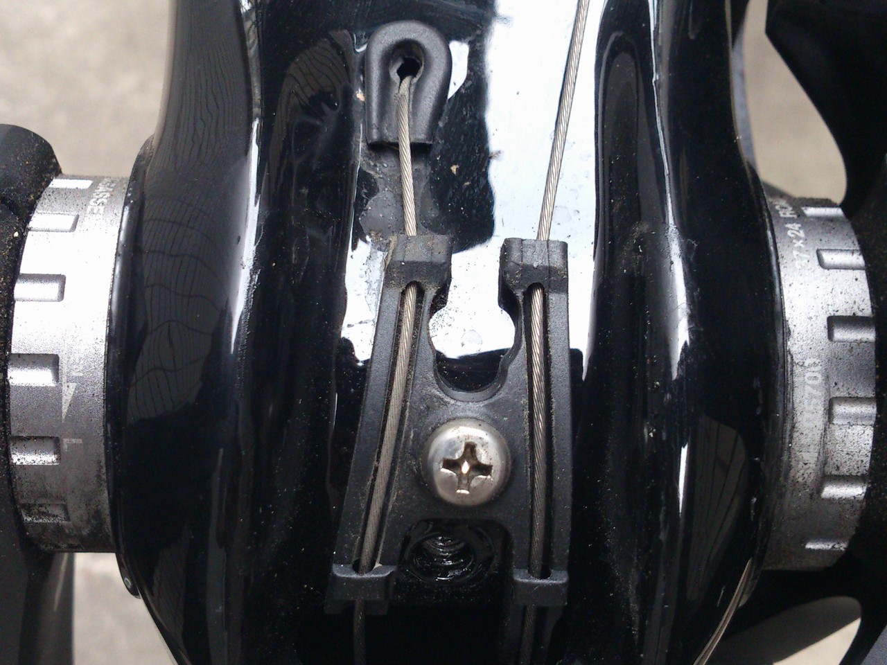 この樹脂製のワイヤーガイドは硬質プラでできているので、本来であればそう簡単に削れたり割れたりはしません。しかしKHARMA EVOではワイヤーの取り回しがBB下のガイドからフロントディレイラーへ急角度で繋がってるせいか、この涙滴型のガイドにかなりの負担がかかっているようです。