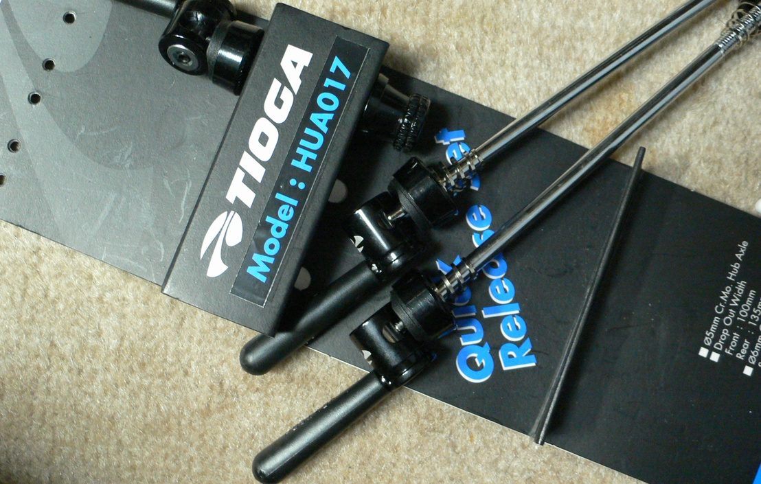 今付いている純正のSHIMANO製クイックリリースレバーが銀色の安っぽい感じだったので、これをTIOGAのHUA01700に変えることにしました。